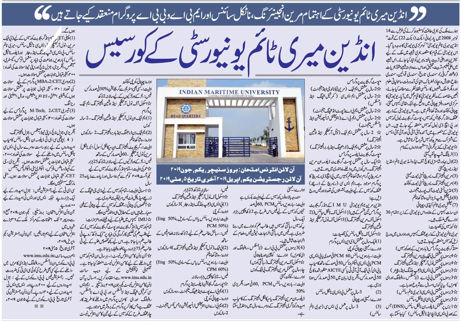 Indian Maritime Umiversity ke ehtemaam marine Engg.,Nautical Science, MBA wa BBA program munaqqid kiye jate hain